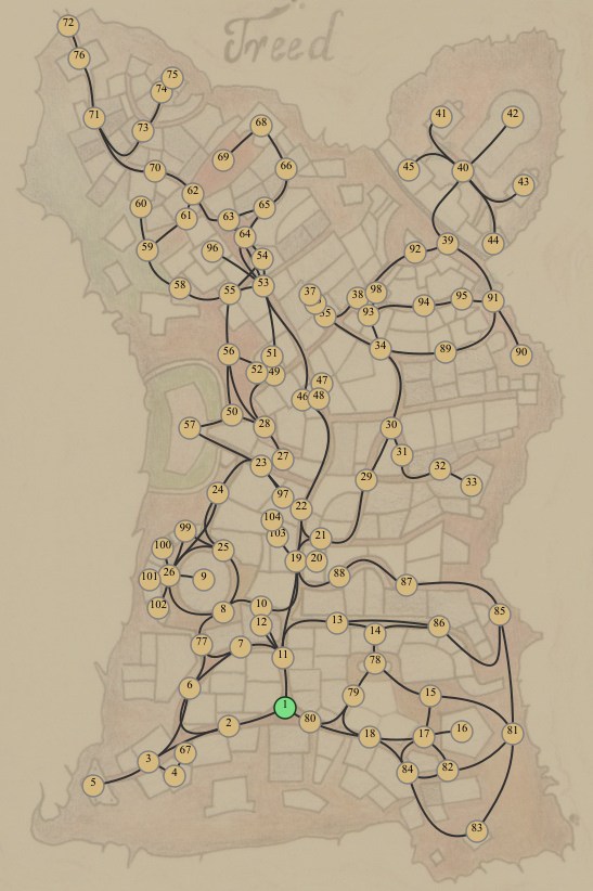 A város közepén (#48) harcolnod kell (-3 É), de megkapod a szép kulcsot, egy jelet a kezedre és a hatalmas kardot (+4).